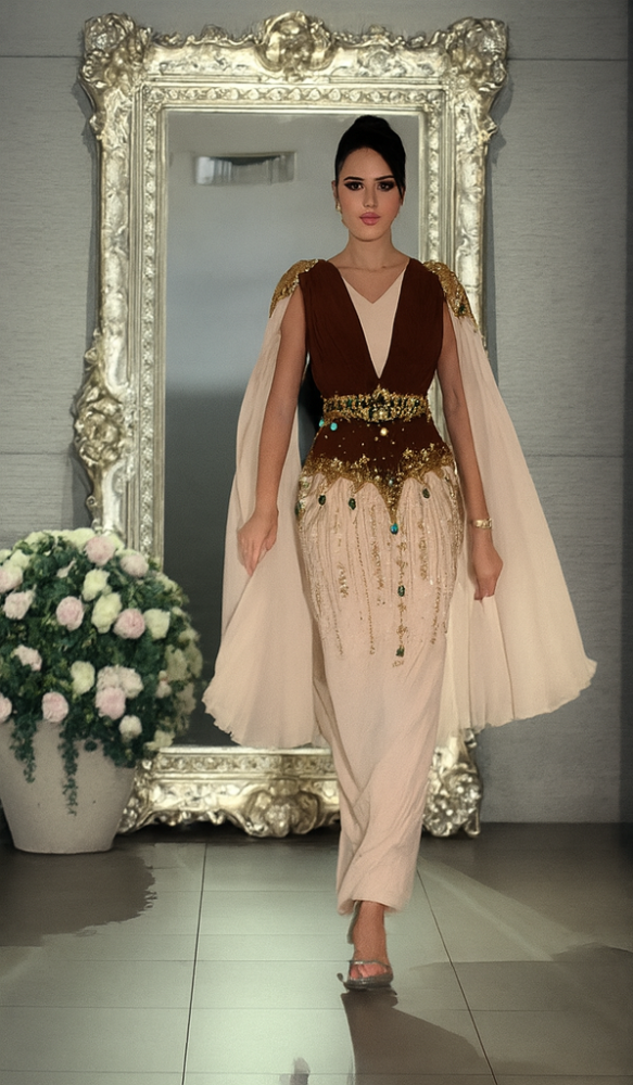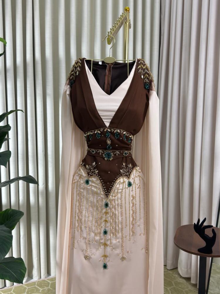 فستان سهره شيفون بيج في بني مزين بشيفون ناعم يمنح إطلالة أنثوية ساحرة تصميمه الطويل يضيف حركة رقيقة وفاخرة ويبرز القوام مع خامة خفيفة توفر راحة مثالية طوال السهرة
